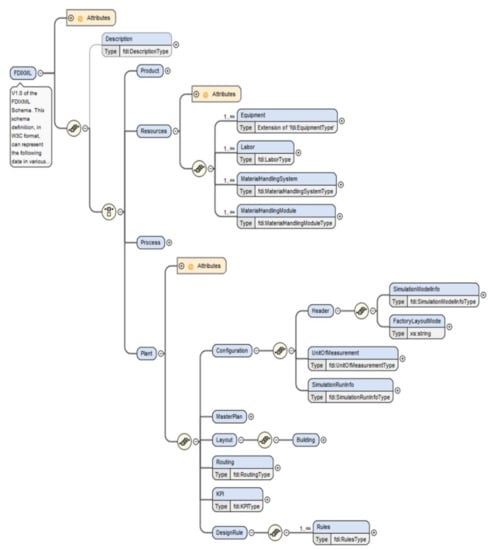 By analyzing the input and output of these activities and tasks, and XML data schema was designed as shown in Figure 3 [34]. Table 1 summarizes the physical elements constituting the factory such as machines, material handling systems, and labors, and logical elements such as process areas, routing, and rules. Each element has its own data type.
