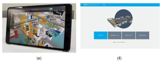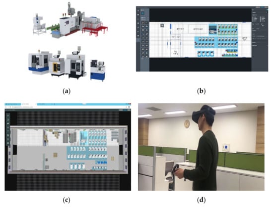 As shown in Figure 4b, the user can arrange the factory layout as if playing a game in the process layout authoring tool by using the machines and material handling systems library in the factory shown in Figure 4b. Based on the deployed layout, a 3D virtual factory model is automatically generated, and the realistic 3D factory visualized on the web can be checked through the visualization function as shown in Figure 4c. As pictured in Figure 4d, the factory can be evaluated using VR devices such as Oculus, and the factory can also be evaluated via mobile as shown in Figure 4e. When sensor data and KPIs that need to be connected to the physical factory are defined in the form of types and items, RESTful APIs are automatically created for shop floor connection through MES or IoT platforms. Connected real-time data and KPIs can be checked in real time through the digital twin. Figure 4f shows the screen of the integrated monitoring system implemented.