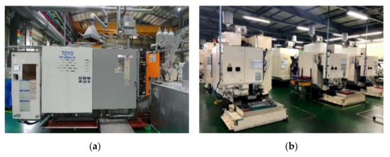 The company “K” supplies modules for eco-friendly and intelligent automobiles, and connectors for digital home appliances and IT devices. It is a global manufacturing company that has their headquarters in South Korea and operates 13 factories in Asia, Europe, and America. The company “K” also used the edge device as shown in Figure 6 and built a digital twin-based control and monitoring system in the same way as company “N”. Figure 7a shows the target injection molding machines. Figure 7b shows the 3D modelled machines, and Figure 7c shows the entire digital twin of the shopfloor. On the left and right sides, information on temperature and humidity of the factory, operation status, machines, and molds are provided in the form of charts.
