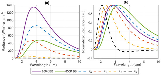 Numerical integration over a period of time of Equations (5)–(7), leads to the spectra associated with each harmonic (, , ). The result is shown in Figure 1a, where the spectra of the blackbodies at the extreme temperatures (650 K and 800 K), are compared to those of the first Fourier amplitudes of the modulated radiance. For a sinusoidal modulation of T as in Equation (12), high-order harmonics are not zero due to the non-linear relation between temperature and radiance but, as expected, their intensity decreases for increasing order (only the first cosine terms have been represented; for a cosine modulation as in (12), the sine terms are zero).