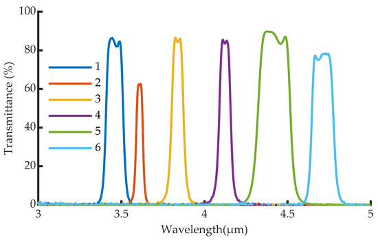 Spectral transmittance of the six interference filters used in the infrared camera. Each color represents a different optical filter.