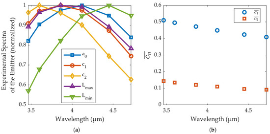 The continuous part of the signal (), the first and second harmonics ( and ), and the maximum and minimum radiance of the emitter during each cycle ( and ) for each filter are shown in Figure 4a. The different harmonics and radiances have been normalized to the unit to make their comparison easier.