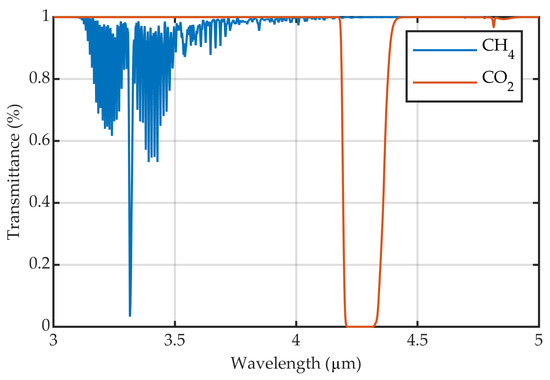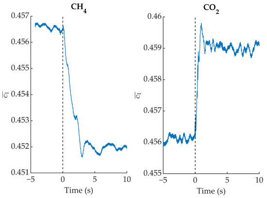 For a gas cell filled with air, will assume a value which is approximately the average in the spectral band of the camera (m to m). However, when it is filled with CH, the contribution of short wavelengths decreases (due to absorption in the range between m and m). These wavelengths have large values (see Figure 4b), and therefore the measured value will decrease. On the other hand, when the gas cell is filled with CO, it is the contribution of long wavelengths (between m and m), with small values, that decreases, and thus the measured value should increase. This effect is shown in Figure 7, where is plotted when CO and CH are injected alternatively into the gas cell.