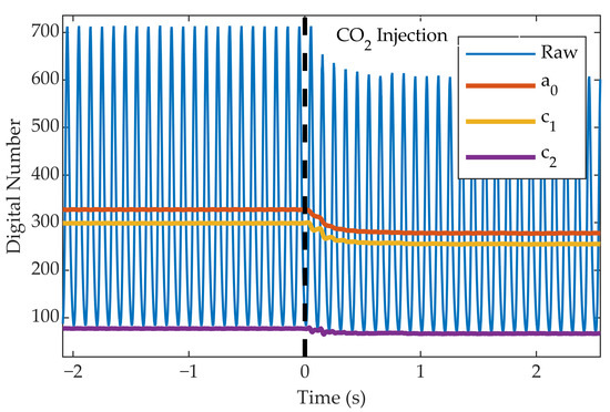 When a gas is injected into the gas cell, a decrease is observed in the value of the raw signal and the post-processed harmonics. Figure 6 shows this effect for the CO injection. Therefore, using the signal of a single harmonic, it is possible to calculate the integrated absorption of the medium for its spectral profile and, if a single known gas is present in the gas cell, to obtain its concentration (using the Beer–Lambert law (Equation (16)). However, if we do not assume which gas is present in the gas cell, in principle we cannot determine if the signal decreases because of the presence of CO or CH. Nevertheless, the combination of multiple harmonics will enable us to discriminate whether this absorption is due to CO or CH.