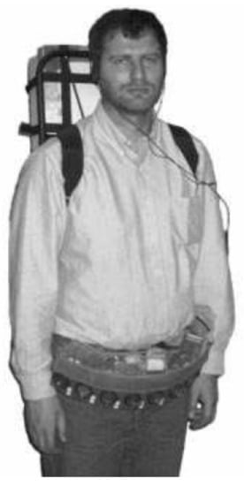 Six different obstacle detection/avoidance devices with one or two mini cameras mounted on glasses or slightly above the eyes will now be presented. They potentially allow the user to explore the environment by moving their head, similar to a sighted person. The SVETA aid [46] consists of stereo cameras worn slightly above the eyes, earphones and a compact computing device in a waist-worn pouch (see Figure 1). The Intelligent Glasses have two mini cameras mounted on spectacles [45]. The vOICe uses a digital television camera attached to spectacles and connected to a special purpose portable computer [41,47]. Its software has now been loaded onto a mobile phone, making the phone camera available to the device. The camera images are processed without filtering to avoid removing important information.