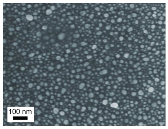SNFs, which are ensembles of silver nanoparticles randomly distributed over a glass surface, were prepared by doping a soda-lime glass slide (Agar Scientific Ltd., Essex, UK) with silver ions via silver-to-sodium ion-exchange and annealing the silver-containing glass in a hydrogen atmosphere, as described elsewhere [16,20]. For ion-exchange, we immersed the slide for 20 min in AgNO3-NaNO3 melt containing 5 wt.% of AgNO3 (LenReactiv, St. Petersburg, Russia) heated to 325 °C. Annealing in hydrogen was performed for 15 min at 250 °C. A typical scanning electron microscope (SEM, Supra 25, Zeiss, Oberkochen, Germany) image of the prepared SNF is demonstrated in Figure 1.