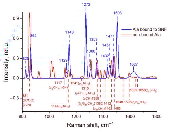 The comparison of the averaged Raman scattering spectra of the non-bound Ala and Ala bound to SNF is presented in Figure 2. The peaks in the spectrum of non-bound Ala are assigned to vibration modes of Ala crystallites in accordance with reference [26]. One can see in Figure 2 that the spectrum of Ala bound to SNF differs from the reference spectra of Ala crystallites. This difference is much more profound than the difference between the spectra of crystallites and the published spectra of concentrated aqueous solutions (these spectra are relatively similar for alanine) [24]. Most peaks assigned to vibration modes of C-N, NH3, and CH3 shifted, while the peaks at 923 and 1017 cm−1 assigned to the vibration modes of COO [27] and C-C are missing. Due to strong shifts, the assignment is not unambiguous, but it clearly indicates that the binding mostly leads to a shift and an enhancement of the peaks corresponding to NH3. On the contrary, in the SERS spectra, there are no peaks corresponding to COO. This observation is different for several reports of SERS spectra of alanine on a silver surface in distilled water, in which most peaks can be mapped to peaks of crystallite alanine and reliably assigned. In distilled water, the changes in peak intensities usually evidence the binding of amino acid to metal through the COO group [9,10] with a very weak enhancement of the NH3 group, but in our conditions, this mode of binding is not supported by the observed spectrum. It should be noted that in some studies of amino acids, an enhancement of the NH3 group has also been observed [11], so the mode of binding is not universal.