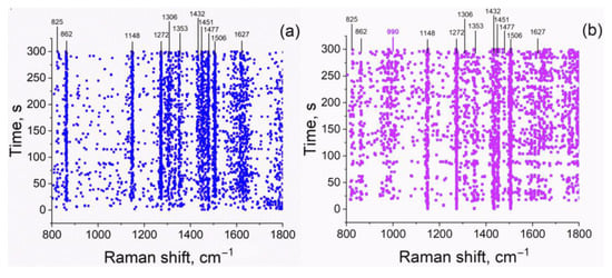 Raman peaks positions maps for (a) Ala and (b) Ser bound to SNF in PBS. Each point on the map corresponds to a feasible peak in the respective spectrum, as detected by the local maximum method [22].