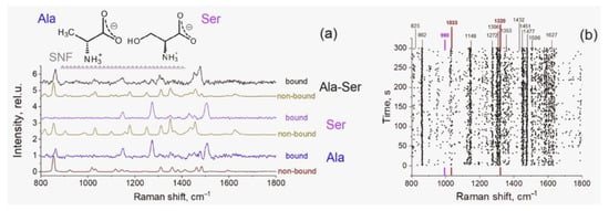 (a) Most significant spectral contributions (PC1 loadings) in the data matrices of Raman spectra of Ala, Ser, and 1:1 Ala-Ser mixture (theoretical sum) bound to SNF in PBS and in crystalline form (non-bound) Top: chemical structures of Ala and Ser in the vicinity of SNF (below the structures). (b) Raman peaks positions map for Ala-Ser mixture bound to SNF in PBS: black labels—Ala and Ser common peaks, magenta label—Ser only peak, red labels—Ala-Ser only peaks.
