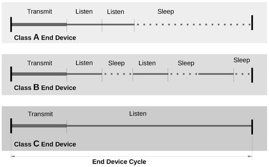 A LoRaWAN network relies on a star topology and comprises three types of devices: end devices (EDs) that serve as LoRa sensors, gateways (GWs), and a network server (NS). EDs are the data gatherers that send their information to one or more gateways in their range, using an ALOHA protocol to access the wireless medium. A GW receives a LoRa packet and forwards it to the network server that may either accept or discard it. In this way, most of the computational burden is handled by the NS, thus simplifying the complexity of the other devices (specifically EDs), with consequent benefits, particularly in terms of power consumption. In this regard, as described in [26], the job cycle of EDs is split into three parts, namely transmit, listen and sleep, as shown in Figure 1, which reflect the respective operational modes of the node. The beginning of a cycle is determined by beacon messages sent by the GWs, which, in turn, are synchronized by the NS. The end devices are grouped into three different classes: All (A), Beacon (B), Continuous (C). The three classes have a common transmit phase in which nodes can randomly access the network to transmit their data, whereas they differentiate on the subsequent phases. After transmission, Class A EDs open one or two consecutive temporal listen windows, in which they can receive messages coming from the NS. Then, class A EDs enter the sleep mode. Class B EDs extend such behavior, potentially opening more listening windows at scheduled times. Finally, Class C EDs, after transmission, enter the listening mode which is maintained until the end of the cycle. In practice, the sleep mode is never entered by such EDs. Clearly, moving from Class A to Class C, the power consumption of EDs increases.