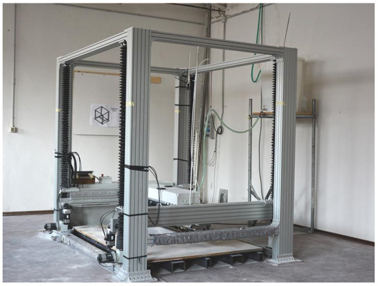 The ADMIN 4D project is an IIoT ecosystem based on a large powder-bed 3D printer, like that shown in Figure 2 for the additive manufacture of concrete-like artifacts. The additive manufacturing technology is based on the composition of layers of dusts and natural bindings that are solidified due to a chemical reaction. Several types of materials can be employed for artifact construction, because the bindings are conceived to react with a wide range of diverse components. As an example, marble powder and river/sea sand have been effectively used in preliminary tests of the printer. This achievement is particularly beneficial and interesting for the whole project, since it reflects the very limited environmental impact of the production phase. Recycled materials, such as the wastes of marble processing, can be used after they are shredded and reduced to powder, giving new life to materials that, otherwise, would have been disposed of.