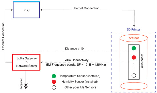 In the artifact production phase, the embedded sensors transmit measurement data, typically temperature and humidity, to the gateway and network server. All nodes of the LoRaWAN network are placed close to each other, typically in the range of a few meters. Figure 3 shows the configuration of the ADMIN 4D components involved in the production phase. As can be seen, the PLC receives data from the gateway, connected to it via an ethernet interface. In addition, the gateway is connected to the Internet for the transmission of sensor data to a remote cloud.