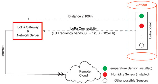 After the production phase, artifacts are placed in their final deployment sites, from which they continue to transmit sensor data. The new system architecture of data transmission is depicted in Figure 4. The EDs, gateway and network server are placed at a distance of some tens of meters. Sensor data is transmitted to the remote cloud by the gateway, which is connected to the Internet. This data is used for artifact monitoring as well as for offline analyses. Monitoring is necessary to detect possible artifact anomalies, especially during the first period after the final deployment. Additional sensors may be used for this activity; for example, strain gauges may be very helpful for the detection of unexpected artifact deformations. Clearly, such sensors have to be inserted during the production phase, but may be (remotely) activated later on. Offline analyses allow implementation of a kind of “long–term feedback”, since the outcomes will be used to tune the parameters of future artifact production. For both these activities, the typical requirements for the communication system are extended transmission ranges, high reliability, low power consumption, and sending periods that range from tens of minutes to hours. To obtain meaningful results, the sensors have to transmit their data for a long time after artifact deployment. Thus, a further important requirement relates to the lifetime of the batteries, which, for the ADMIN 4D project, was set to a minimum of one year.
