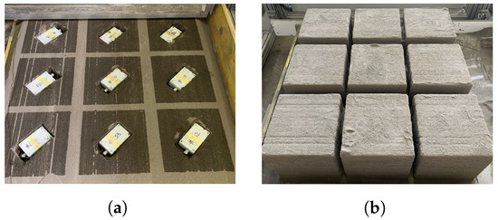 For this experimental setup, the tests concerned only the Tinovi smart sensor, since the Microchip LoRa mote had already been assessed in a recent study [34] under analogous conditions, and was demonstrated to be able to reach distances of more than 100 m when embedded into a sample artifact. Therefore, to perform the tests, the Tinovi sensors were embedded in a composite of river sand and binders like the final substrate used for the printing process. Figure 6 illustrates two steps of this process relevant to the printing of nine cubes of 40 cm side.