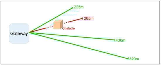 Once the artifact was devised, the LoRa gateway was positioned inside the main ADMIN–4D office and the ED was placed in four different outdoor locations to evaluate its transmission behavior. As in the previous tests, the experiments were performed with the same spreading factor, ; transmission tests were considered as passed when the GW received at least three-quarters of the transmitted data without errors. The results are presented in Figure 7, where the green lines stand for successful trials, while the red line indicates a failure in the transmissions.