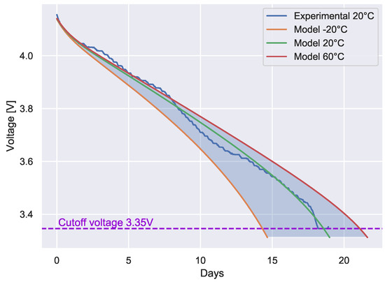 The calibrated model was then used to simulate the discharge curves for different temperature ranges. The results are reported in Figure 8. As can be observed, the battery lifetime was strongly dependent on the operating temperature.
