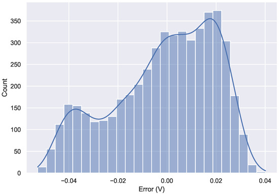 To obtain realistic results, the model parameters were tuned using the results of the experimental measurements carried out at 20 . Then the model was calibrated to match the boundaries of the discharge curve and to minimize the error in the central part. The probability density function of the calibration error is shown in Figure 9. As can be seen, the calibration error was limited to the range −0.05 –0.04 , making it suitable for the intended use.