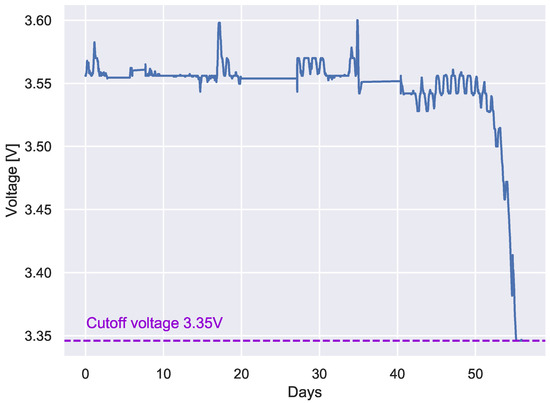 From the figure, it can be observed that the employed Li-ion batteries ensured continuous and reliable operations for 18 days, after which the battery voltage dropped below the cutoff voltage. A further observation was that the obtained duration and discharge curve partially refuted the preliminary linear estimation model for Li-ion batteries proposed in [41]. Thus, in order to achieve a better estimate of the battery lifetime for different temperature ranges, the popular model described in [42,43] was adopted (the same model is implemented in the Mathworks Simscape suite).