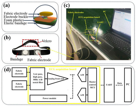 Figure 2a outlines the assembly structure of the fabric electrode. Foam plastics were placed between the elastic bandage and the fabric electrode to improve the contact area between electrode and skin and maintain uniform force on the electrode. The fabric electrodes are combined on an elastic bandage with Velcro. The bandage was mounted on the body to measure the signal in Figure 2b. The Velcro position can be adjusted to meet with the requirement of consistent pressure based on the tested human body. The ECG signal acquisition setup is depicted in Figure 2c. The ECG signal collected with the assembled fabric electrode was processed by the ECG acquisition board and then fed back to the PC to record the voltage amplitude of the ECG signal.