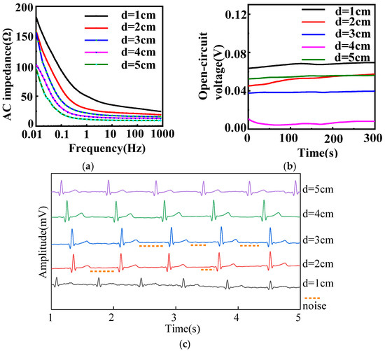 Figure 3. (a) AC impedance, (b) open-circuit voltage, and (c) static ECG signals of different diameters with 12/5 sateen and 35 picks/cm for fabric electrodes. (d represents the diameter).