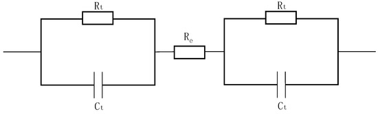 The equivalent circuit of AC impedance for a pair of fabric electrodes is shown in Figure 4. The fabric electrode can be modeled as a parallel circuit described by an equivalent AC impedance (Z), which is composed of the resistance of the fabric electrode (Rt) and the electric double-layer capacitor between the fabric electrode and the sodium chloride solution (Ct). The resistance of the sodium chloride solution (Re) is negligible.