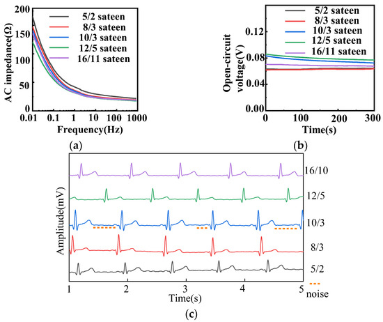 Figure 5. (a) AC impedance, (b) open-circuit voltage, and (c) static ECG signals of different fabric weaves with 4 cm diameter and 35 picks/cm for fabric electrodes.