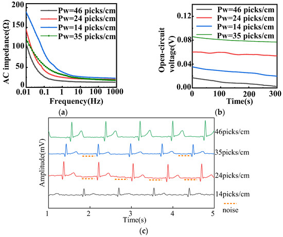 Figure 6. (a) AC impedance, (b) open-circuit voltage, and (c) static ECG signals of different weft densities with 4 cm diameter and 12/5 sateen for fabric electrodes. (Pw represents the weft density).