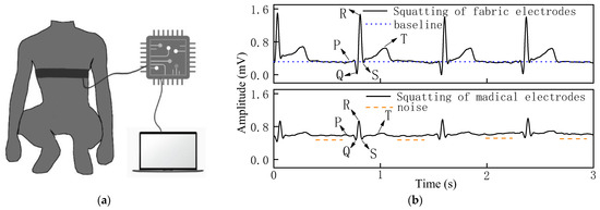 Figure 7. (a) Process of measuring ECG signal in squatting state. (b) ECG signal of woven fabric electrodes and standard medical electrodes in squatting state.