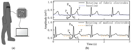 The ECG signal was measured at a room temperature of 25 ± 1 °C and a relative humidity of 65 ± 2%. The subject was required to sit for 5 min while breathing evenly before the static ECG signal was measured. For dynamic ECG testing, three dynamic conditions in the standing position were devised: swinging (arms swing back and forth with a range of motion from 0° to 90°), squatting (arms hang down naturally while the subject slowly squats until they are completely squatting), and rotating (arms hang down naturally, rotating 360° in place). These three motions were chosen with reference [28] taking into account the common actions of daily life. A unipolar chest lead was used, the center points of the positive and negative electrodes were 8–9 cm apart, and the test position was 3–4 cm below the thoracic nipple. It was confirmed that the complete characteristic waveform could be obtained from the recorded ECG signals.