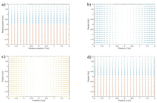 Rewriting Equation (3) into Equation (4) allows splitting the velocity vector field into subfields from Figure 1a (axis x), Figure 1b (axis y), and Figure 1c (axis z).