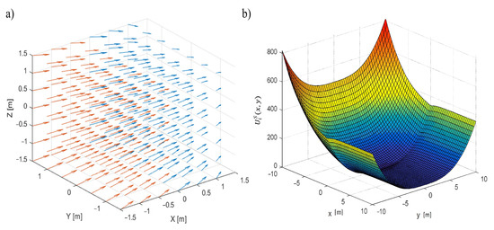 In Figure 1a,d, velocity vector fields are in different colors to indicate areas of the acceleration and deceleration zones. Figure 1 explains the global asymptotical stability of position tracking based on the AAPF approach. A potential function for the velocity vector field in Figure 1a reaches its minimum equal to zero along the line of axis y (1). Similarly, potential functions for the velocity vector fields in Figure 1b,c have minimums equal to zero along axis x. Therefore, the sum of all potential functions giving the AAPF from Equation (1) has a minimum located exactly at the point of intersection of two lines of axes x and y. If the minimum equals zero and the value of the function for each value of x, y, and z, is greater than zero, the function will satisfy conditions for Lyapunov function and global asymptotical stability [20].