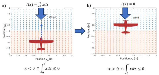 Comparing Equations (6) and (7) with (5), it can be noticed that if the integral equals zero, the following identity is true . While for nonzero values of the integral , the strength of the acceleration or deceleration effect is proportional to . The purpose of integral terms is to overcome the disturbance impacts on position tracking. Therefore, the integral should compensate for the steady-state error in axis x, only when the source of disturbance and a UAV are on the opposite sides of the tracked point. If a UAV is on the same side of the tracking point where the wind gust comes from, the integral will only amplify the wind effect, causing instability. Hence, the integral has the meaning for position tracking only when its sign is the same as the sign of the tracking error. Hence, a definition of the integral is as follows: