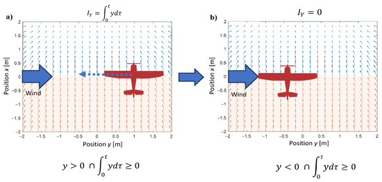 Similar to Equation (8), the action of integrals terms in the control for axes y and z should be correlated to the direction of wind and UAV’s relative position (Figure 4). Hence, their definitions are identical: