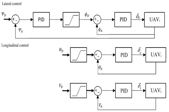 The output of the nonlinear PID controller applied to the control of position tracking is a velocity vector whose length and spatial attitude guide the UAV toward the tracking point. Usually, UAV’s guidance applies loops of lateral and longitudinal control based on three following state variables: heading angle, pitch angle, and airspeed. Outputs of these loops are set-point inputs for inner control loops of deflections of steering elements, i.e., ailerons, elevators, and the throttle of a propeller engine. Therefore, the UAV’s control system has a hierarchical structure, typically based on traditional PID controllers with feedforward terms and gains scheduling. Figure 5 presents the structure of lateral and longitudinal control of a fixed-wing UAV. The nonlinear PID controller of the loop of position tracking is the most outer loop in the structure, hence the velocity vector is the input for the guidance layer. To calculate set-points for heading, pitch, and airspeed loops, it is necessary to apply the following equations [20]: