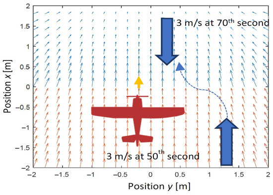 The first scenario of simulations assumes that there is a wind gust on the left side of the flight path. It starts at the 50th second of simulations and changes its direction to about at the 70th second. The tracked reference point is moving with a constant speed equal to 15 m/s along a straight line. The maximum speed of wind gust is 5 m/s. The scenario is in Figure 6.