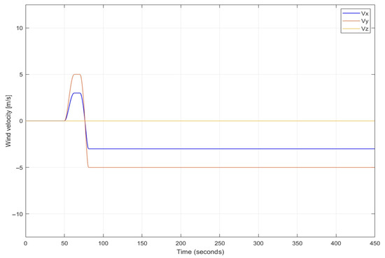 Figure 8 presents time plots of velocityof simulated discrete wind gusts in the same coordinates frame, in which the UAV tracks a target position. Simulations used the model of a wind gust of the standard “1-cosine” shape as it is in the Military Specification MIL-F-8785C [27,28].