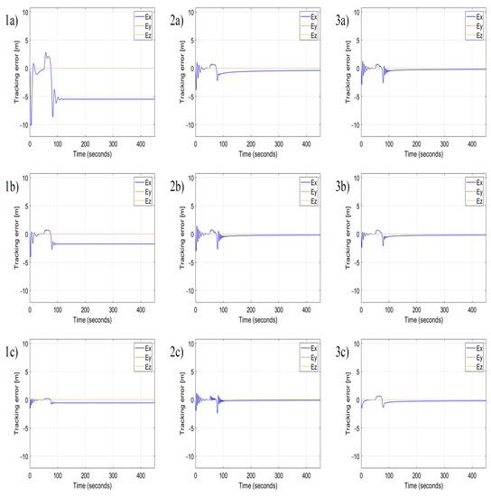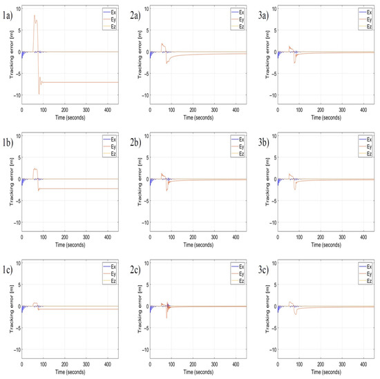 In each simulation, the other parameters are constant, i.e., , . The longitudinal control of position tracking uses only the nonlinear proportional term P, therefore, the following parameters , , , and are zero. Based on subplots in Figure 9(1a–1c), the increment of the value of results in the decrement of tracking error , rise and set time, and in the increment of regulation overshoots, but the tracking error in the steady-state remains constant. This confirms that the coefficient has the property of the gain of the proportional term in the standard PID controller. Whereas the increment of value progressively reduces the steady-state error in time (Figure 9(2a–2c), simultaneously it increases the magnitude and frequency of overshoots after the appearance of gusts. Therefore, coefficients and have the same meaning as the gain of the integral term of PID, and they are inversely proportional to the time constant . Finally, the increment of value reduces the magnitude and the frequency of overshoots like the derivative term of the standard PID does. The role of the derivative term is to react and suppress rapid changes of position tracking errors. Therefore, coefficients and are identical to gains of the derivative term of PID, i.e., , and they are proportional to the time constant . Comparing Figure 9(1a) with Figure 9(3c) proves the effectiveness of the nonlinear PID controller based on AAPF. There is a significant improvement in the response of the position tracking control to a lateral wind gust by a conspicuous reduction of the position tracking error, also in the steady-state, the decrement of rising and setting time, and the minimization of overshoots. Because the nonlinear PID controller uses the AAPF as the base, even large values of discussed coefficients will not cause instability and therefore PID tuning by Ziegler–Nicholson method is not possible in this case. Figure 10 presents results for the second scenario which assumes a sequence of gusts in the longitudinal direction relative to the flight path. For the control in the lateral direction, it uses values of coefficients , , , , from Figure 9(3c). Time plots of tracking error in this figure allow formulating conclusions that are identical as it is in the case of lateral gusts. Coefficients and are gains of the proportional terms of the nonlinear PID, , are gains of the integral terms, and , are gains of the derivative terms, respectively for the deceleration zone and the acceleration zone according to the asymmetry of the velocity vector field (Figure 1). Gains of the proportional terms minimize the tracking error and rising and setting time, while gains of the integral terms minimize the steady-state error but increase overshoots, and gains of derivative terms decrease overshoot magnitude and frequency.