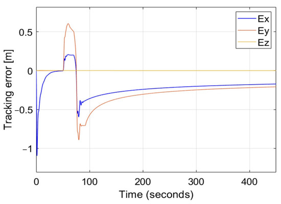 Because there is an interdependence between the lateral and the longitudinal controls observed as oscillations of when lateral gusts appear in Figure 9, it is necessary to verify the response of the control in the case of simultaneous gusts in both lateral and longitudinal directions. The sequence of gusts and their speeds are identical to what was in the previous scenarios. Figure 11 presents time plots of tracking errors for such a situation while it uses the nonlinear PID controller with coefficients , , , = = = = 1 and = = = =10. There are overshoots at the 70th second of simulation in comparison to plots from Figure 9(3c) and Figure 10(3c), but generally, the tracking error does not exceed 1 m and it decreases smoothly in time. This confirms the effectiveness of the control and the validity of the extension of AAPF with integral and derivative PID terms, making position tracking control for nonholonomic UAVs more stable and robust to environmental disturbances.
