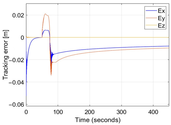 Figure 9 presents a comparison of time plots of position tracking errors for the nonlinear P, PI, and PID controllers based on the AAPF in the case of a lateral wind gust. To observe differences in the response of each type of nonlinear controller, the used values for each coefficient of , , , , , are as follows: 0.1, 1, and 10.
