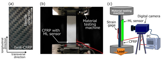 (a) Photographs of twill-CFRP with bidirectional fiber bundles, (b) twill-CFRP with ML sensor assembled in material testing machine, and (c) schematic illustration of experimental set up for the tensile testing.