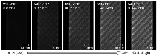 CFRP is manufactured as laminated structures of differently oriented layers to meet the required anisotropic strength [1,2,3]. However, when CFRP laminates are used in products, such a complex and anisotropic structure complicates the prediction of stress–strain distributions. Furthermore, the earliest damage to CFRP laminates is a transverse crack in the resin, which causes serious damage such as fiber breakage and delamination. To ensure the reliability of CFRP as a structural material, it is important to understand the damage generation, progress process, and fracture mechanism. For the damage generation and its behavior, there have been some reports which are limited to the damage assessment before and after static stress analysis [4,5]. If the damage generation and its behavior can be visualized during the mechanical testing, it can contribute to enhancing the performance and ensuring the reliability of CFRP products. Therefore, an in situ evaluation technique, which can provide a dynamic stress–strain distribution and track fracture phenomena, has been strongly demanded.