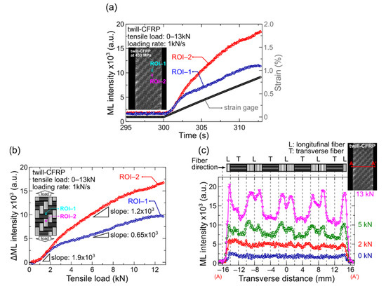 (a) ML sensor and strain gage responses to the tensile load applied to the twill-CFRP in the range of 0–13 kN (inset: positions of ROI–1 and ROI–2 on ML image), (b) dependence of ML intensity on the tensile load for twill-CFRP (inset: illustration of twill-CFRP with ROI–1 and –2 marks), and (c) ML intensity profiles along A–A’ transverse line in inset ML image under different tensile loads in the range of 0–13 kN.