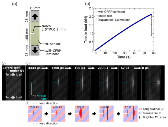 (a) Schematic illustration of twill-CFRP with artificial notch covered with ML sensor, (b) tensile load curve for twill CFRP with artificial notch under tensile testing at a displacement rate of 1mm/min. When the tensile load was approximately 2.1kN, the twill–CFRP was fractured. (c) Photograph of twill-CFRP with ML sensor set in the material testing machine under UV irradiation, (d) representative ML images of a crack propagation process in the tensile testing, and (e) schematic illustration of twill-CFRP surface with bright ML areas.
