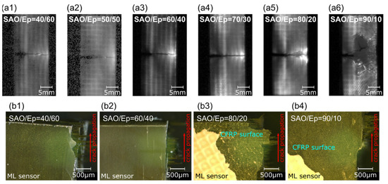 The obtained ML images for each ML sensor at the fracture of the twill-CFRP are summarized in Figure 5(a1–a6). Figure 5(b1–b4) depicts optical microscope images of the twill-CFRP surface with an ML sensor after fracture testing. The optical microscopic observation of the CFRP laminate surface after the fracture testing is performed to confirm the splitting of the ML sensor along the crack propagation route and the exfoliation of the ML sensor from the CFRP laminate surface. It is seen that the ML sensors themselves are broken when the SAOE amount exceeds 80 wt.%. Especially, the ML sensor with 90 wt.% SAOE powder broke as soon as the crack propagation in the twill-CFRP started without tracking the crack propagation. In Figure 5(b3,b4), there is a waffle pattern on the surface of the ML sensors. This is similar to the mesh pattern of the screen mask used in the screen-printing for ML sensor fabrication. High amounts of SAOE powder not only increase the viscosity of the ML paste but also form an inhomogeneous surface of an ML film. Therefore, it is considered that such an ML sensor is unsuitable for visualizing the strain distribution and crack propagation of composite materials because it cannot provide the stress distribution of the measuring objects. In addition, it is found that the ML sensor had peeled off and a bare CFRP surface was exposed after the fracture testing. The ML pattern in a place unrelated to crack propagation, as shown in Figure 5(a5,a6), seems to be due to the exfoliation of the ML sensor from the twill-CFRP laminate. On the contrary, the ML sensors with a lower amount of SAOE powder exhibit good tracking performance with the crack propagation without the fracture of the ML sensor itself, although there is a little noisy pattern. The optical microscopic images after the fracture testing showed no exfoliation of the ML sensor from the surface of the CFRP laminate when the amount of epoxy resin was more than 40 wt.%. Thus, in the crack propagation evaluation, it is necessary to control the mixing ratio of the SAOE powder and epoxy resin. Considering the fracture mechanism for the interface between the ML sensor and the twill-CFRP, it is speculated that the fracture of the ML sensor without tracking the crack propagation was caused by the decrease in the adhesive strength at the interface between the ML sensor and the CFRP laminate. An increase in the SAOE amount in the ML sensor, in other words, a decrease in the amount of epoxy resin, can be a sufficient factor to reduce the adhesive affinity with CFRP with a polyamide resin. Therefore, it can be concluded that when the adhesive strength at the interface between the ML sensor and the CFRP is sufficiently higher than the fracture strength of the ML sensor, it shows superior tracking performance for crack propagation.