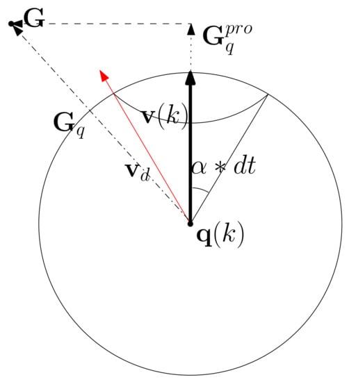 In the case where in (20) satisfies the non-collision requirement in Section 5.1, is utilized as the velocity of the AUV for a single sample duration. Using the definition of , is set so that the AUV moves towards the goal.