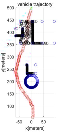In MATLAB simulations, the objectPoints measured by the AUV’s sonar sensors are illustrated with black points. In addition, the AUV’s path is illustrated with red circles. The goal is illustrated with the green asterisk. The simulations use one cylindrical obstacle and multiple box-shaped obstacles. The blue points in the figures indicate the vertices of each obstacle.