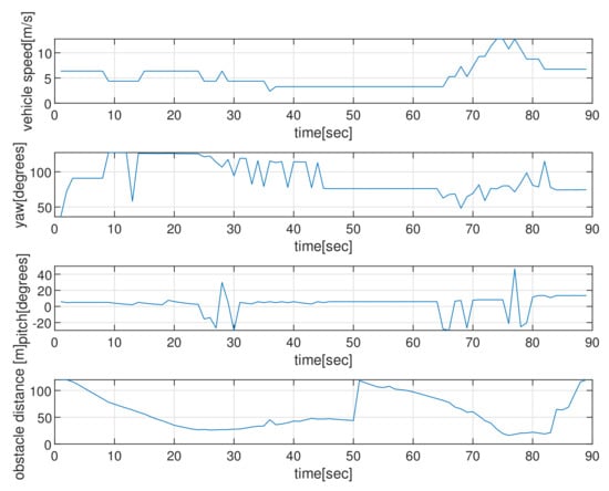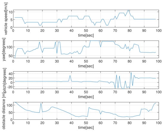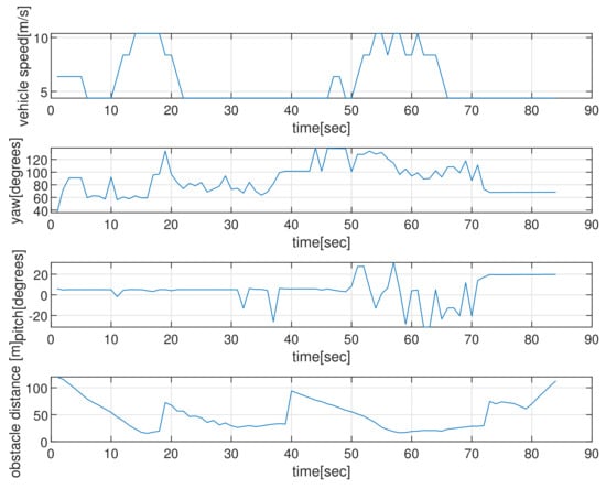 Figure 10 depicts the state (speed, yaw, and pitch) of the AUV as time passes, considering the scenario in Figure 9. The last subplot in Figure 10 presents the obstacle distance (distance from AUV to the closest obstacle) measured by the AUV’s sonar. Initially, the AUV measures a maneuvering cylindrical obstacle surface and varies its yaw for evading collision. See that the AUV changes its state (speed, yaw, and pitch) during the maneuver.