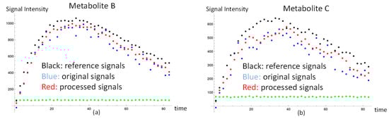 Dynamic metabolite signals and background noise in the simulations. The metabolite signal simulations of high-SNR and low-SNR are shown in (a,b). The black dots represent the high-SNR simulation. The blue dots and the green dots represent, respectively, the signal and background noise in the low-SNR simulation. The red dots represent the processed signals after using our method. The background noise is the same order of magnitude in both metabolites. (a) The reference, raw, and processed signals of metabolite B and the background noise. (b) The reference, raw, and processed signals of metabolite C and the background noise.
