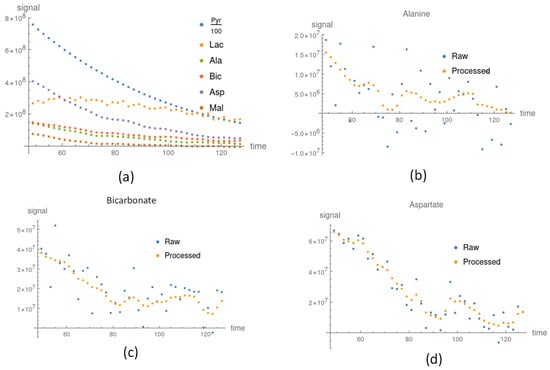 The processed signal after applying our proposed method. (a) Pyruvate and downstream metabolite processed signals in the irradiation group. In the control group, the raw signal was compared to the processed signal for (b) Alanine, (c) Bicarbonate, and (d) Aspartate.