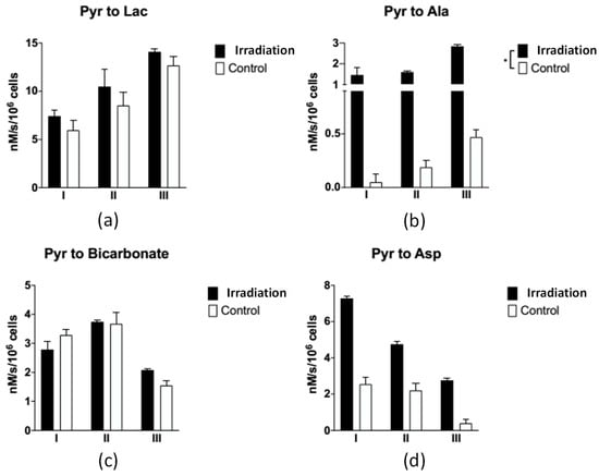 The visible signals of the downstream metabolites in the HP 13C pyruvate in the in vitro studies were lactate, alanine, bicarbonate, aspartate, and malate. Although the malate was visible in the irradiated groups, its signal was too weak to have a reasonable apparent exchange rate constant. Thus, our kinetic model did not include it.